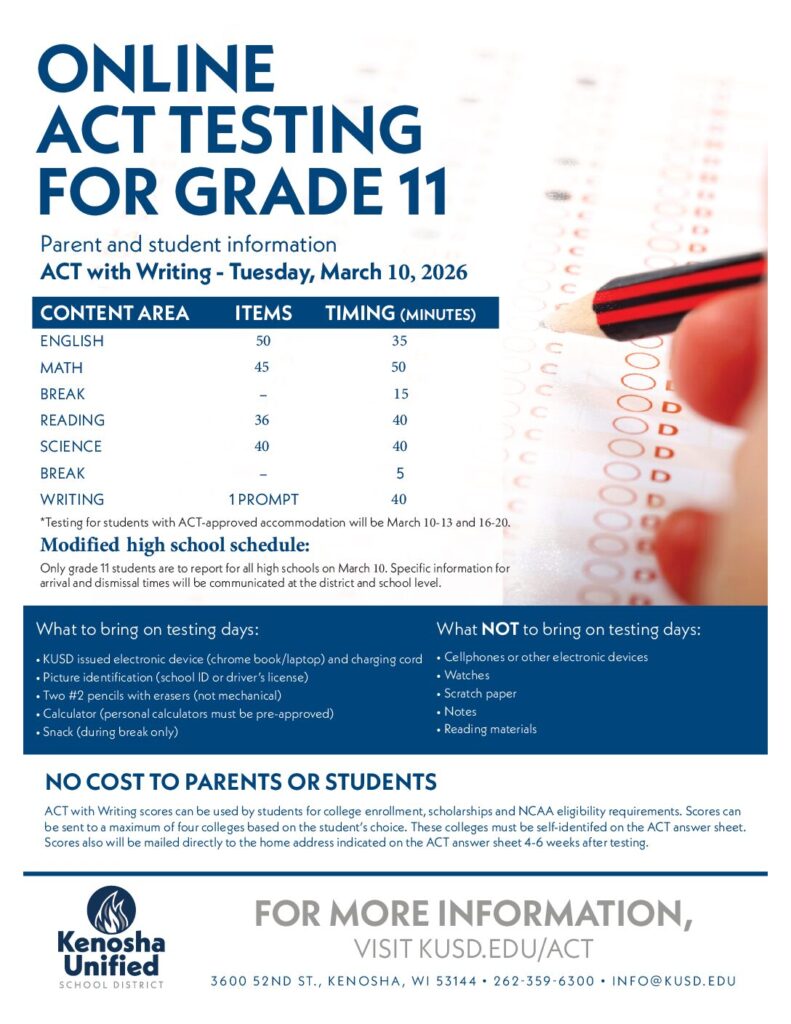 ACT Testing will take place for all 11th Grade students on Tuesday, March 10. Please see the attached information.