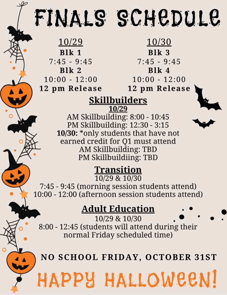 UncategorizedQ1 Finals 24 Oct Finals are coming up next week, Wednesday and Thursday (October 29th and 30th). No School Friday, October 31st